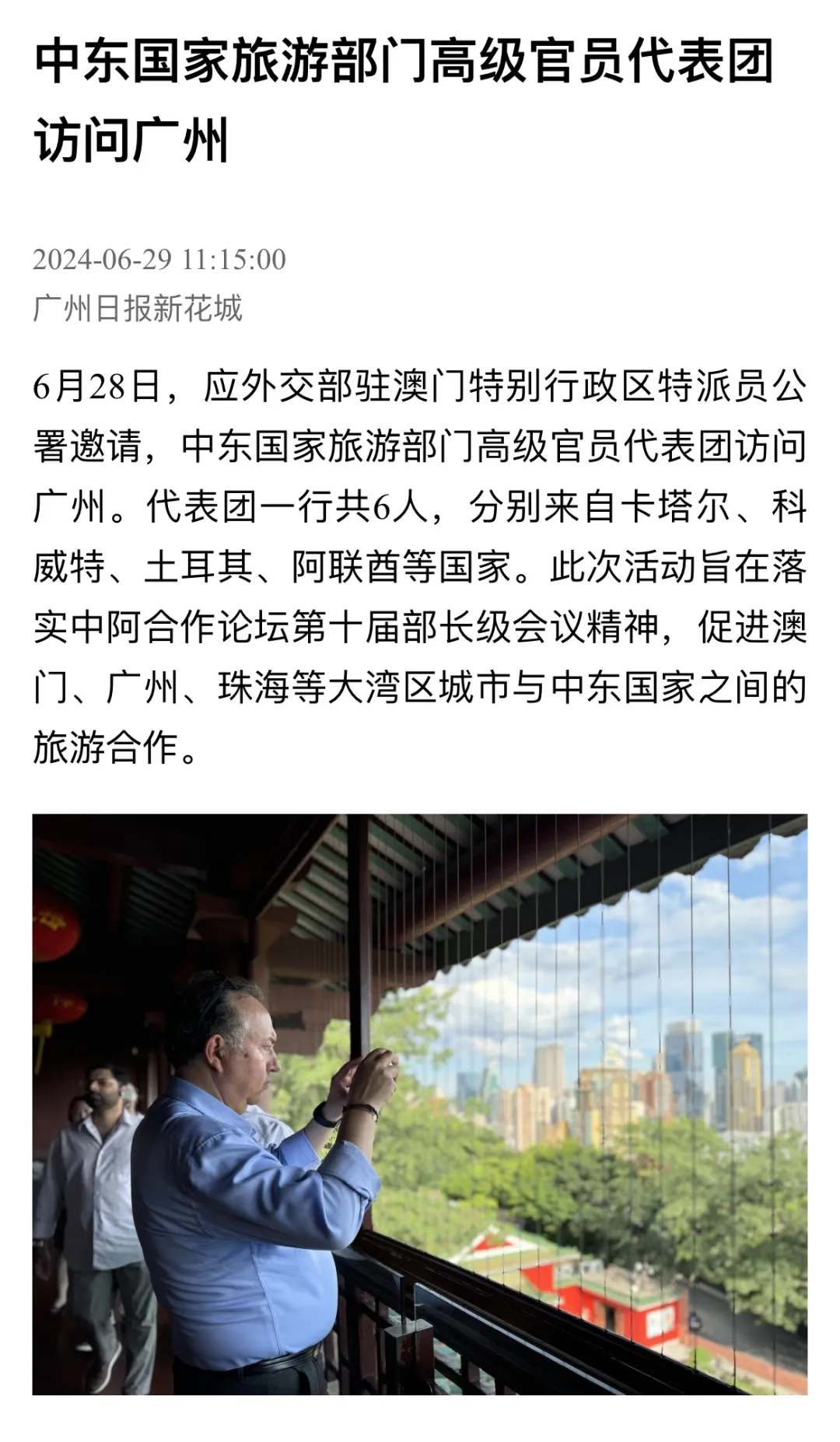 6月28日,應(yīng)外交部駐澳門特別行政區(qū)特派員公署邀請,中東國家旅游部門高級官員代表團訪問廣州。代表團一行共6人,分別來自卡塔爾、科威特、土耳其、阿聯(lián)酋等國家。此次活動旨在落實中阿合作論壇第十屆部長級會議精神,促進中國澳門、廣州、珠海等大灣區(qū)城市與中東國家之間的旅游合作。