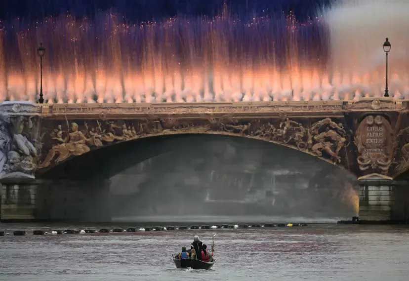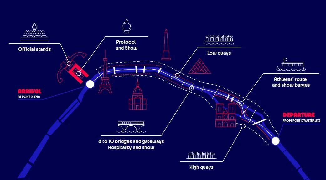 來(lái)自 206 個(gè)代表團(tuán)的 10,500 名運(yùn)動(dòng)員乘坐 80 多艘船只,自東向西蜿蜒穿過(guò)巴黎市中心。奧斯特里茨大橋是航程的起點(diǎn),沿塞納河向西行駛 6 公里,途徑蘊(yùn)藏法國(guó)歷史文化的巴黎圣母院、盧浮宮、奧賽博物館、協(xié)和廣場(chǎng)中心廣場(chǎng)和榮軍院拿破侖陵墓等極具歷史意義的紀(jì)念碑,最終抵達(dá)埃菲爾鐵塔對(duì)面的特羅卡德羅廣場(chǎng)。在這里點(diǎn)燃奧運(yùn)圣火,并正式宣布 2024 年巴黎奧運(yùn)會(huì)開(kāi)幕。