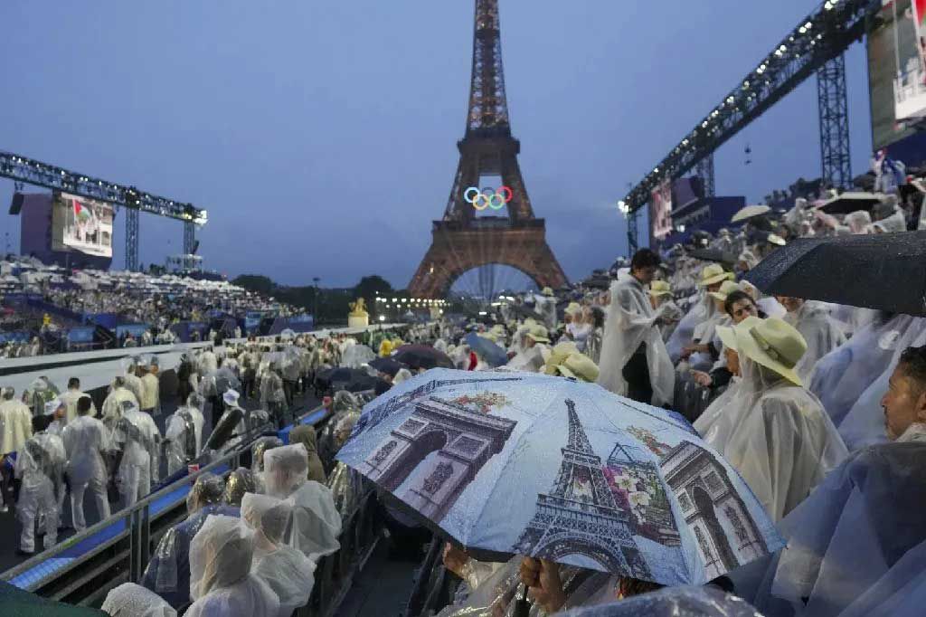 開(kāi)幕式在陰雨天氣中開(kāi)幕......盡管下著雨,人群仍堅(jiān)守在巴黎廣場(chǎng),熱情不減。