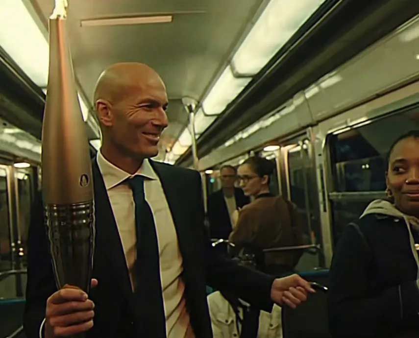 齊內(nèi)丁·齊達(dá)內(nèi)被認(rèn)為是有史以來(lái)最偉大的法國(guó)足球運(yùn)動(dòng)員,也是 1998 年世界杯冠軍,他是此次儀式的第一位大牌球員。在一段預(yù)先錄制的視頻中,他從空蕩蕩的法蘭西體育場(chǎng)接過(guò)奧運(yùn)圣火,然后跑出體育場(chǎng),穿過(guò)法國(guó)標(biāo)志性汽車(chē)組成的五彩斑斕的交通堵塞,將圣火傳遞給一群孩子。
