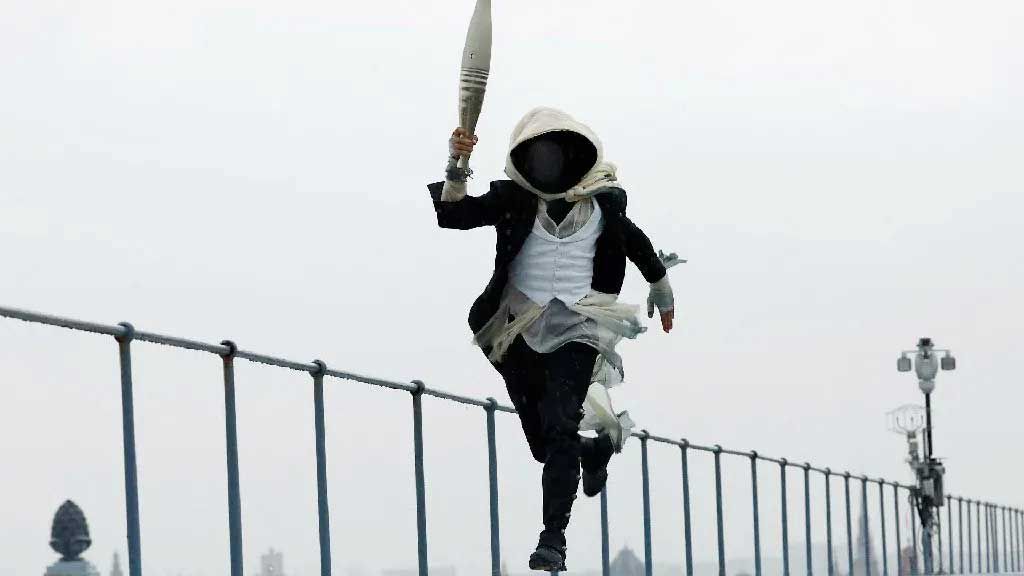 開(kāi)幕式上出現(xiàn)了一位神秘人物,身著兜帽服,從小男孩手中“偷”走了火炬,隨著開(kāi)幕式的展開(kāi),直播畫(huà)面不斷切回到這個(gè)人物身上,他們跳躍著,在巴黎的天際線和標(biāo)志性建筑間做出時(shí)尚的跑酷動(dòng)作。
