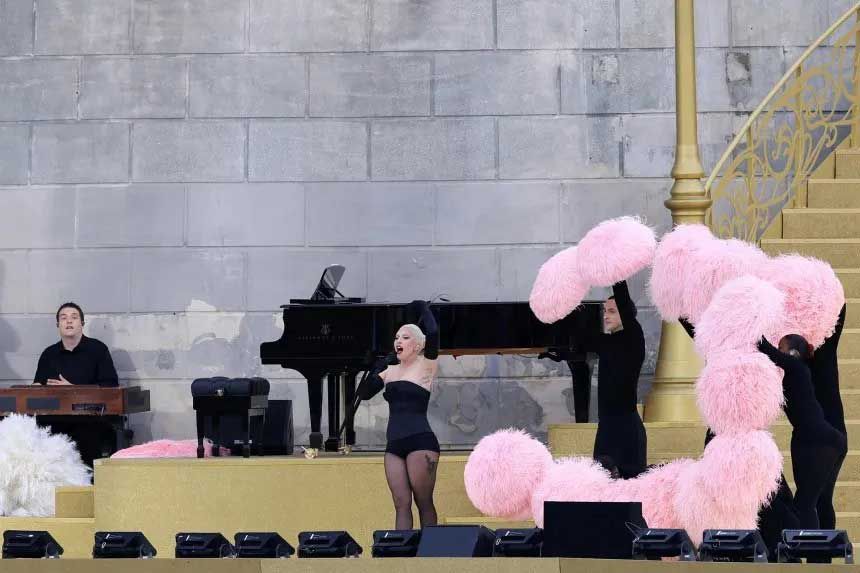 Lady Gaga 在塞納河畔的樓梯上演唱了 Zizi Jeanmaire 的“Mon Truc En Plumes”,拉開(kāi)了奧運(yùn)會(huì)開(kāi)幕式表演的序幕。