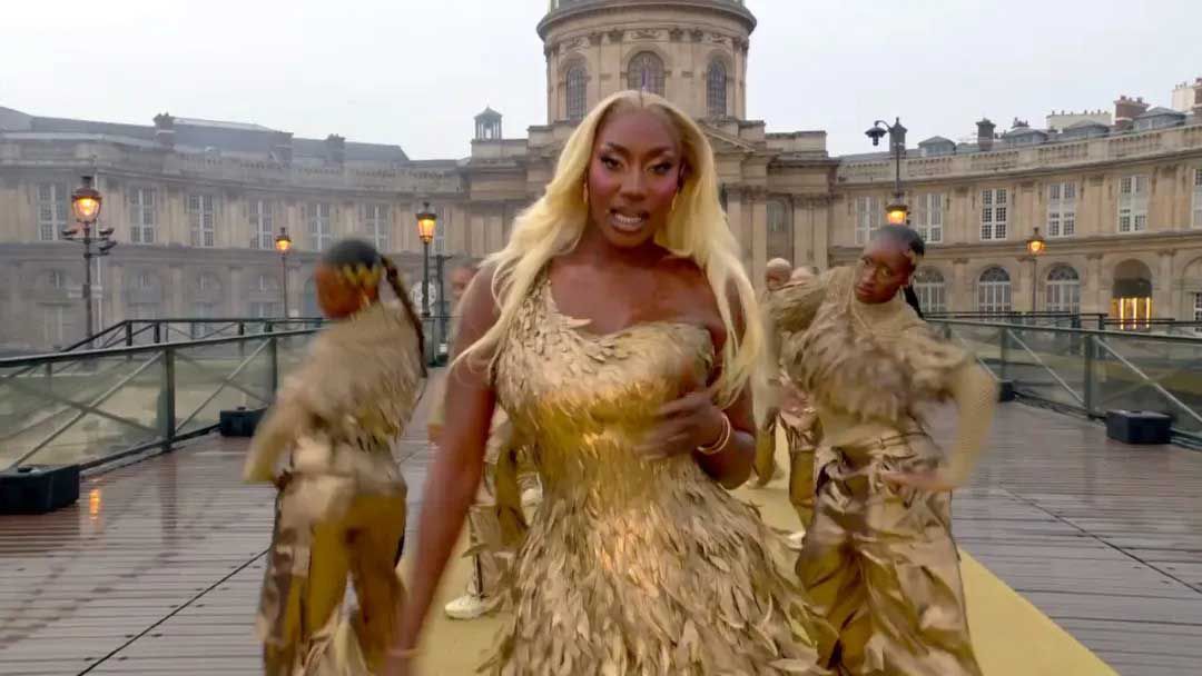 法國(guó)-馬里裔創(chuàng)作歌手中村綾 (Aya Nakamura) 身著金色羽毛禮服登上舞臺(tái),與數(shù)十名成員組成的樂(lè)團(tuán)一起向法國(guó)傳奇歌手夏爾·阿茲納沃爾 (Charles Aznavour) 致敬。