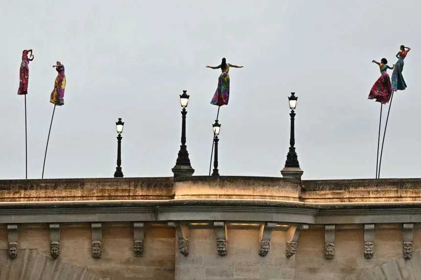 他與主辦方的愿望不謀而合,喬利希望通過(guò)開(kāi)幕式展示法國(guó)文化的多樣性以及法國(guó)歷史所塑造的豐富性和多元性。受到過(guò)往多元文化的影響和啟發(fā),他設(shè)計(jì)了一場(chǎng) 12 幕的大型芭蕾舞,數(shù)百名舞者駐扎在塞納河上的多座橋梁上,前所未有的將隊(duì)伍游行和藝術(shù)表演融為一體。而船只則順流而下,將奧運(yùn)選手載到埃菲爾鐵塔。