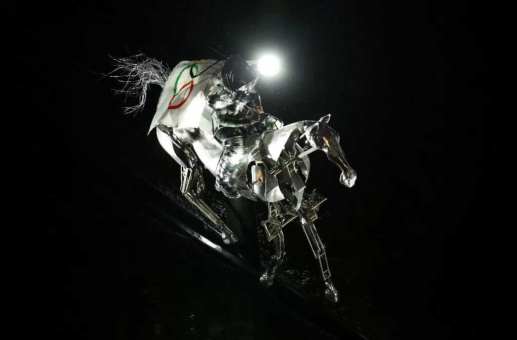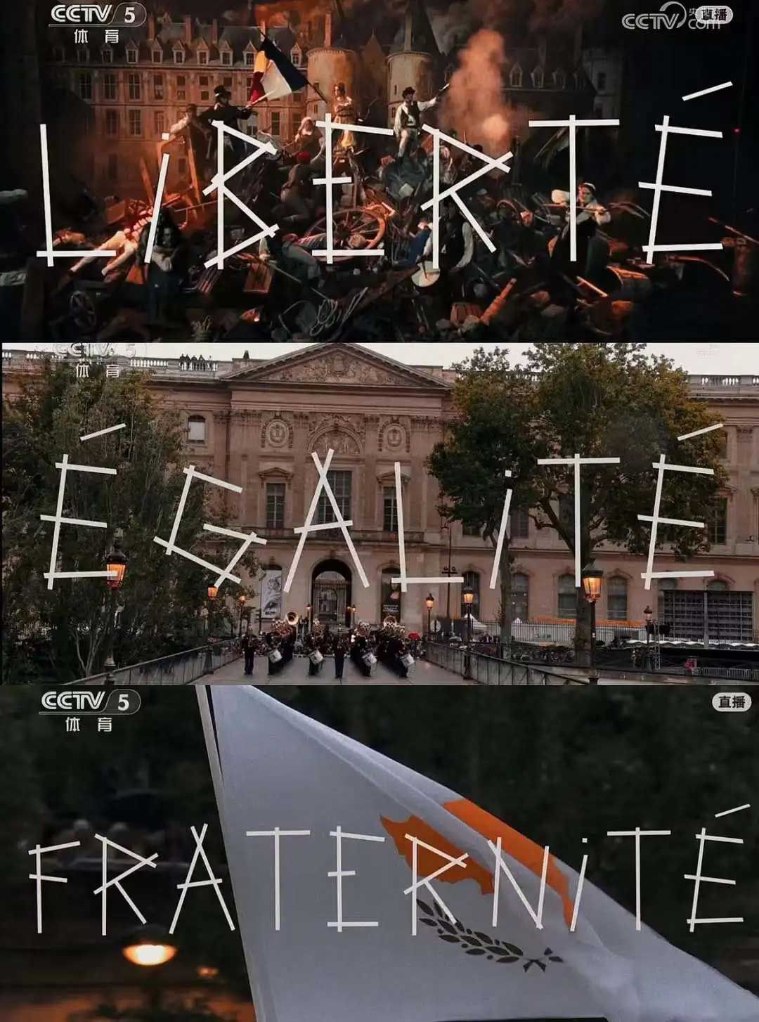 隨后,畫(huà)面變成女騎士騎著一匹真馬,在共和國(guó)衛(wèi)隊(duì)的護(hù)送下,將奧林匹克旗幟帶到了埃菲爾鐵塔附近的特羅卡德羅廣場(chǎng)舞臺(tái)。