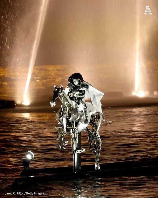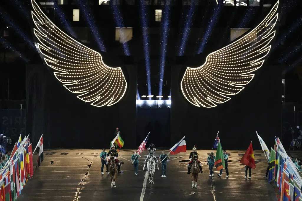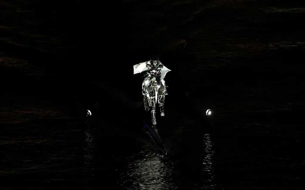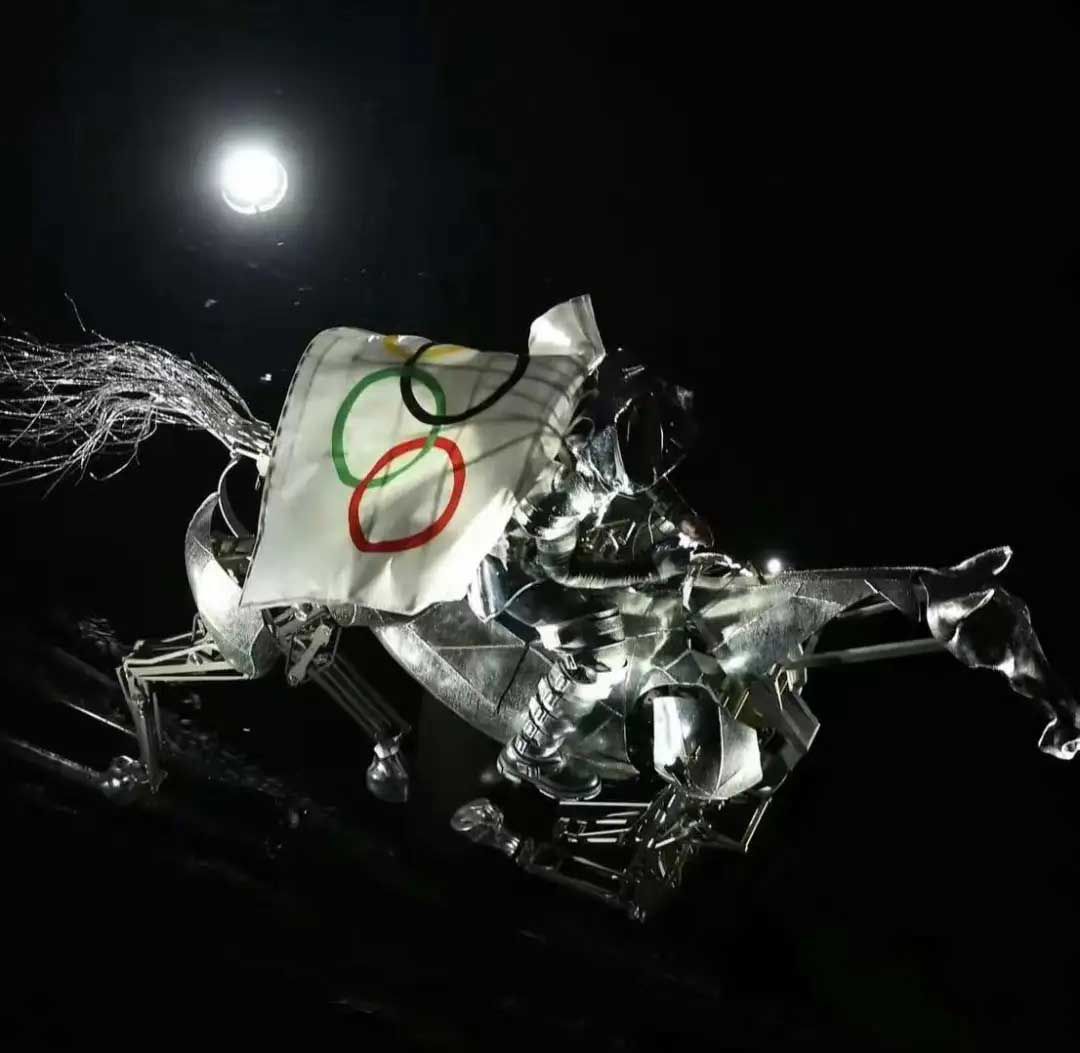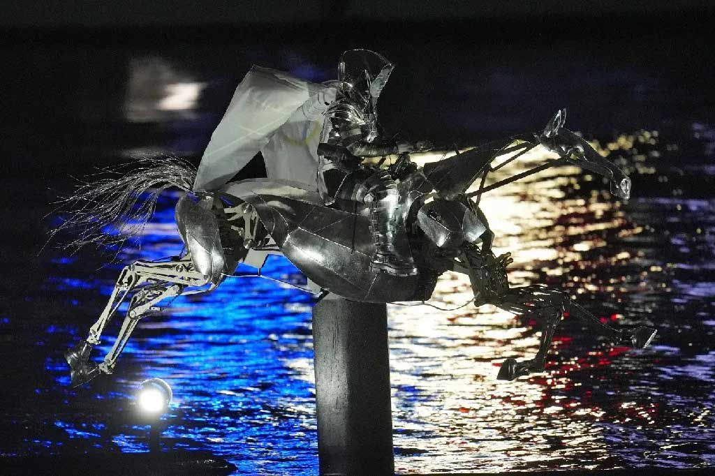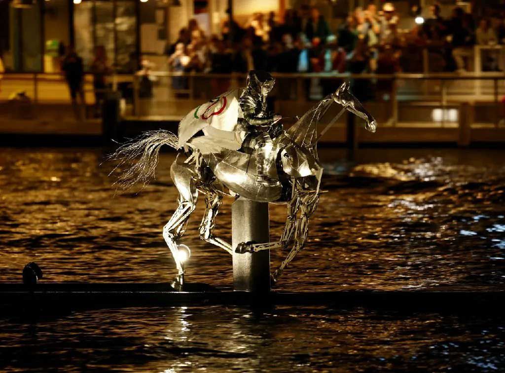 一位女騎手騎著閃閃發(fā)光的金屬馬在塞納河上疾馳,披著飾有奧運(yùn)五環(huán)的斗篷。當(dāng)她穿過(guò)巴黎的一座座橋梁時(shí),鴿子的翅膀展開(kāi),象征著和平的信息。