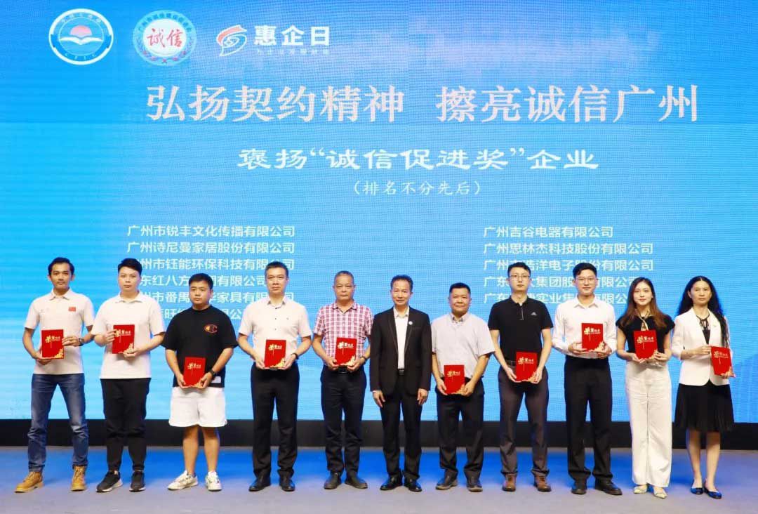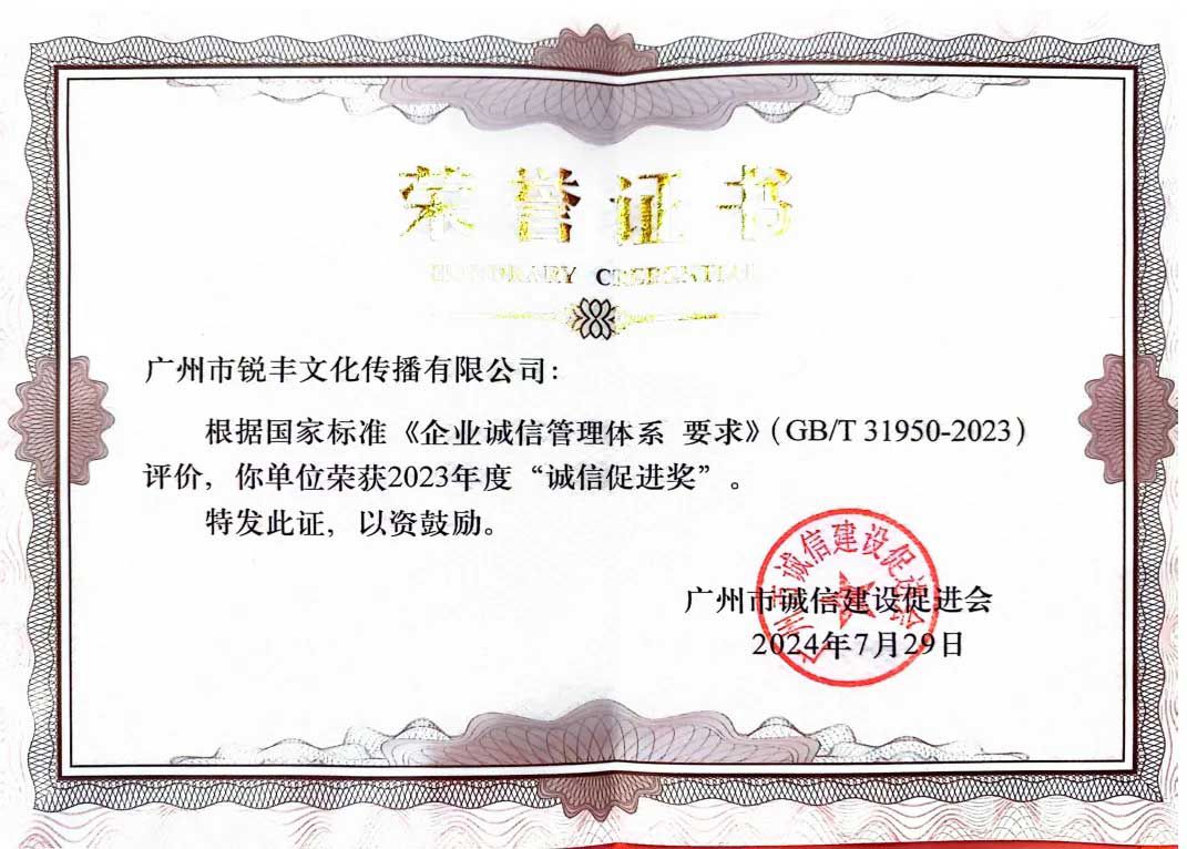 此次會(huì)議旨在弘揚(yáng)廣州千年商都的契約精神,強(qiáng)化民營企業(yè)誠信建設(shè),推動(dòng)企業(yè)進(jìn)入高質(zhì)量發(fā)展軌道。在會(huì)中,銳豐文化憑借其綜合實(shí)力和良好信譽(yù)榮獲“誠信促進(jìn)獎(jiǎng)”,為企業(yè)發(fā)展史再添一筆榮耀!