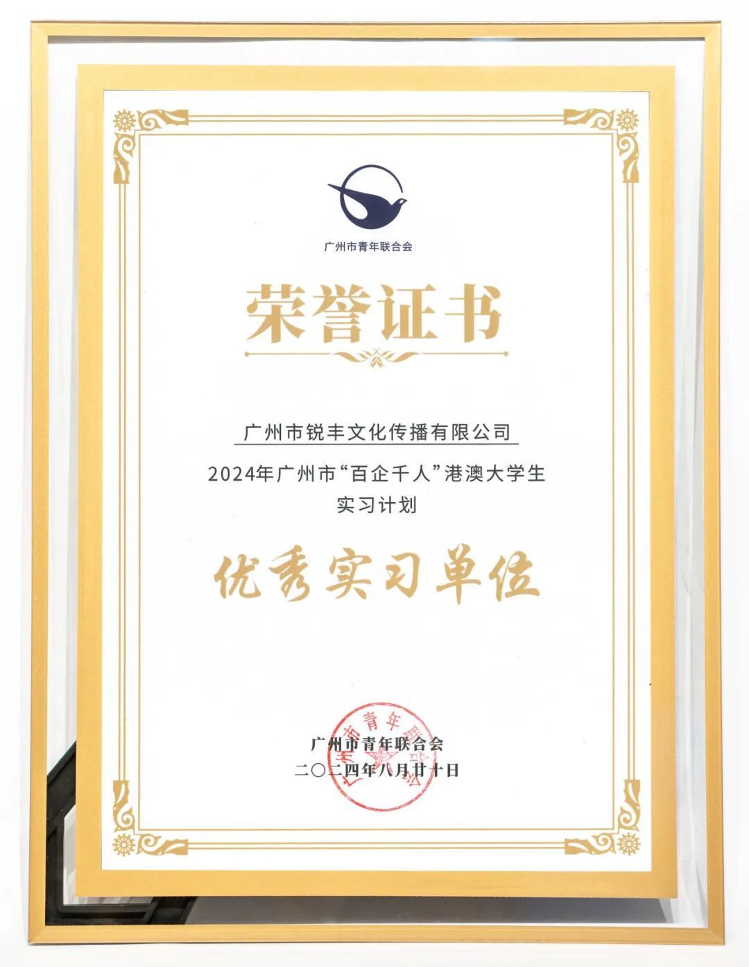● “2024年廣州市‘百企千人’港澳大學(xué)生實習(xí)計劃優(yōu)秀實習(xí)單位”榮譽(yù)證書